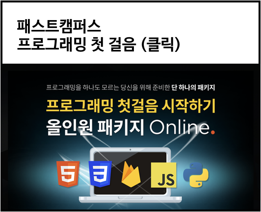 | 패스트캠퍼스 프로그래밍첫걸음 학습후기 ) #1. 프로그래밍첫걸음 첫 수강 (0) | 2019.04.05 |