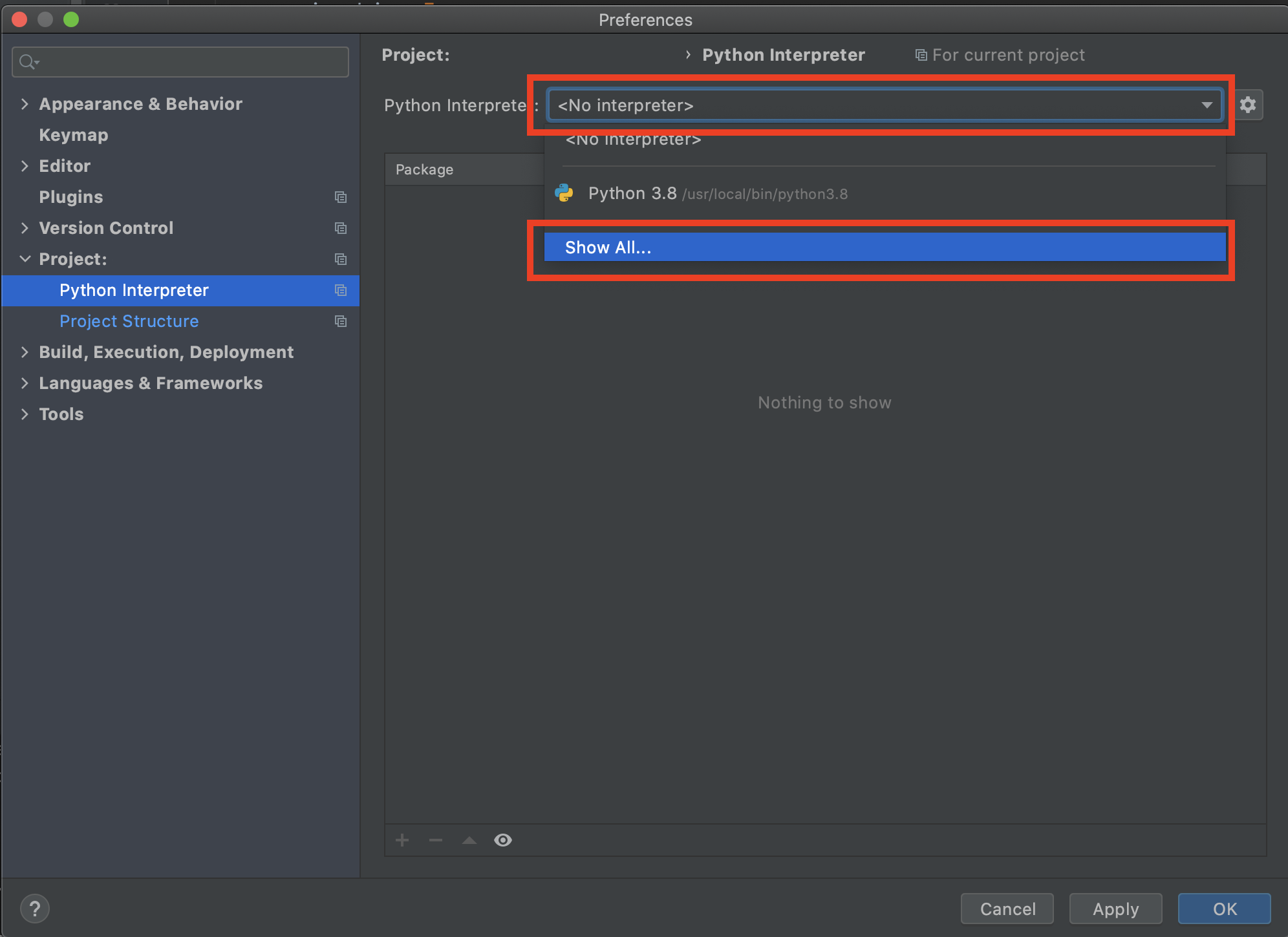 원하는 버전이 아니었기에, Show All... 버튼을 눌러 모든 파이썬 버전의 인터프리터 목록을 찾았다.