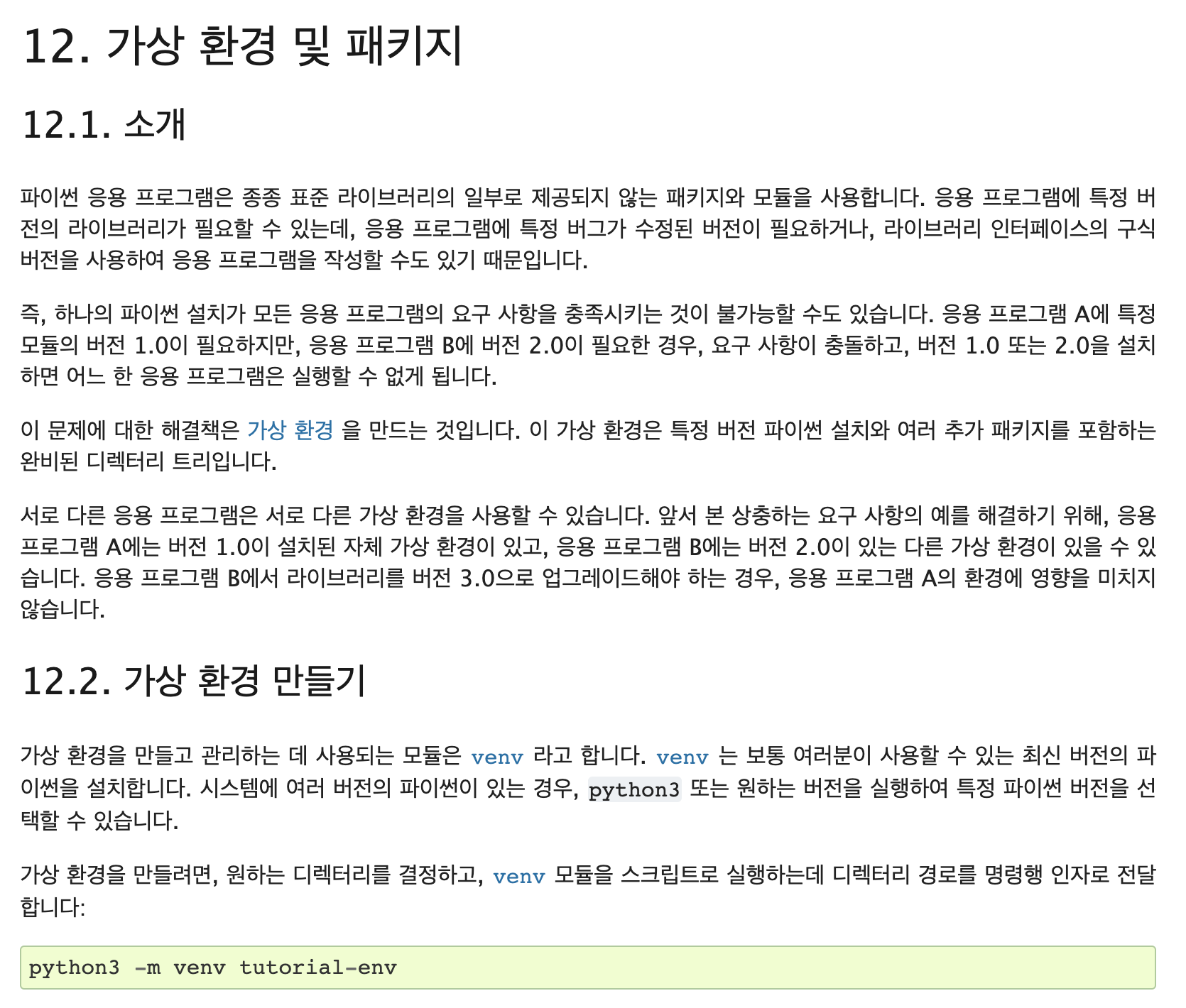 참고로 venv 를 설치하는 방법은 링크에 있어요! 공식 문서 튜토리얼로 제공하고 있어요.