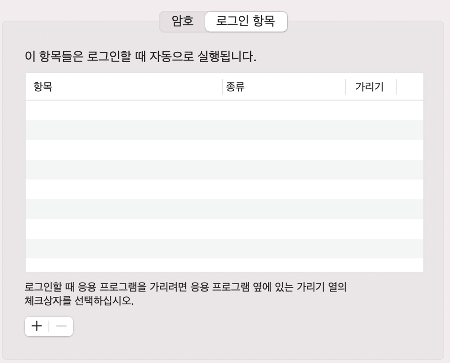 심지어 환경 설정 로그인 항목에서도 보이지가 않습니다.
