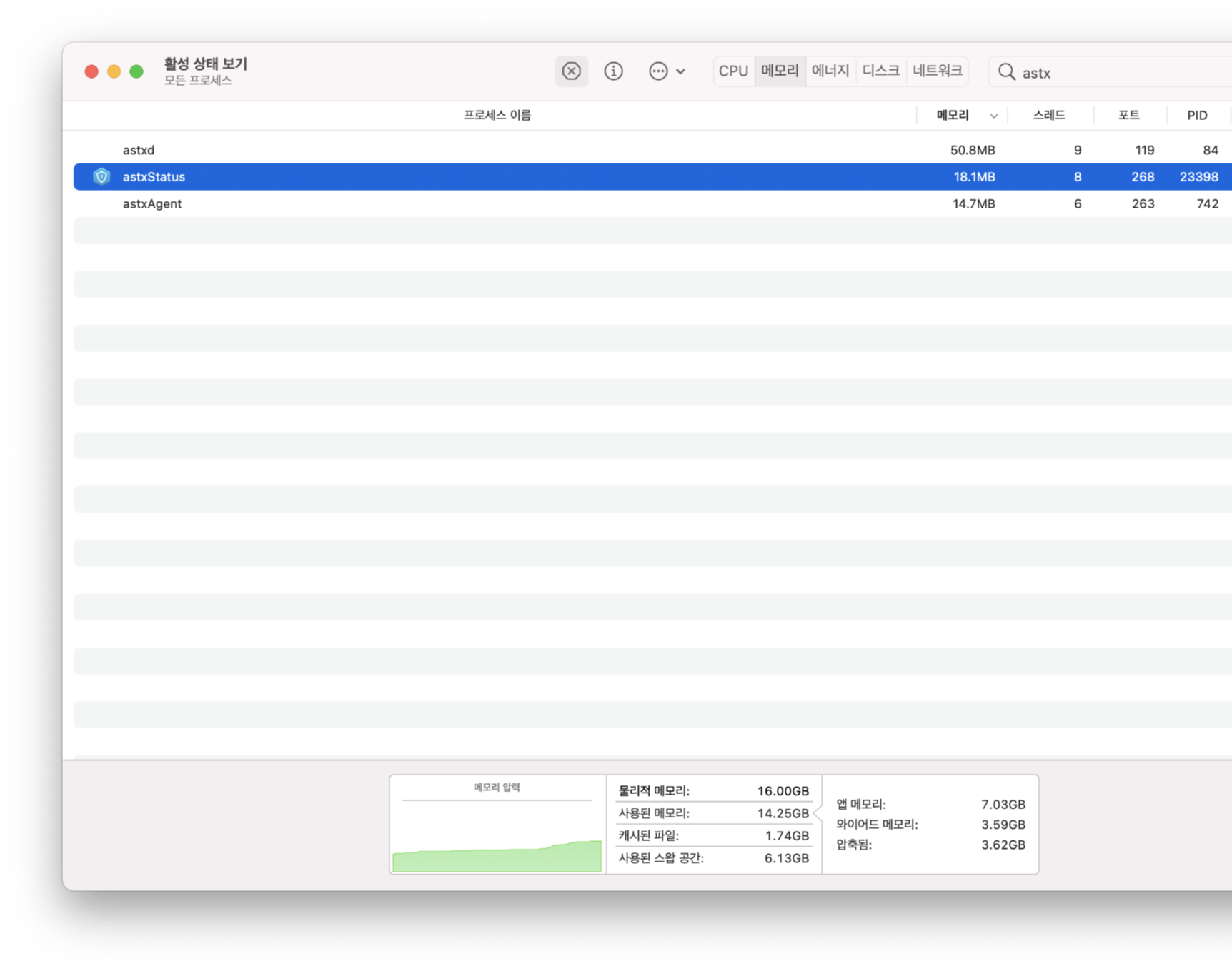 'astx Status' 프로세스 명을 검색하여 해당 프로세스를, 활성 상태보기 상단 X 버튼으로 종료시킵니다.