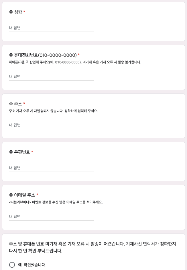 2022년 2월 리뷰 이벤트 신청하기 설문지에서 제 연락처와 도서를 받을 주소를 입력하는 칸이 있어요.