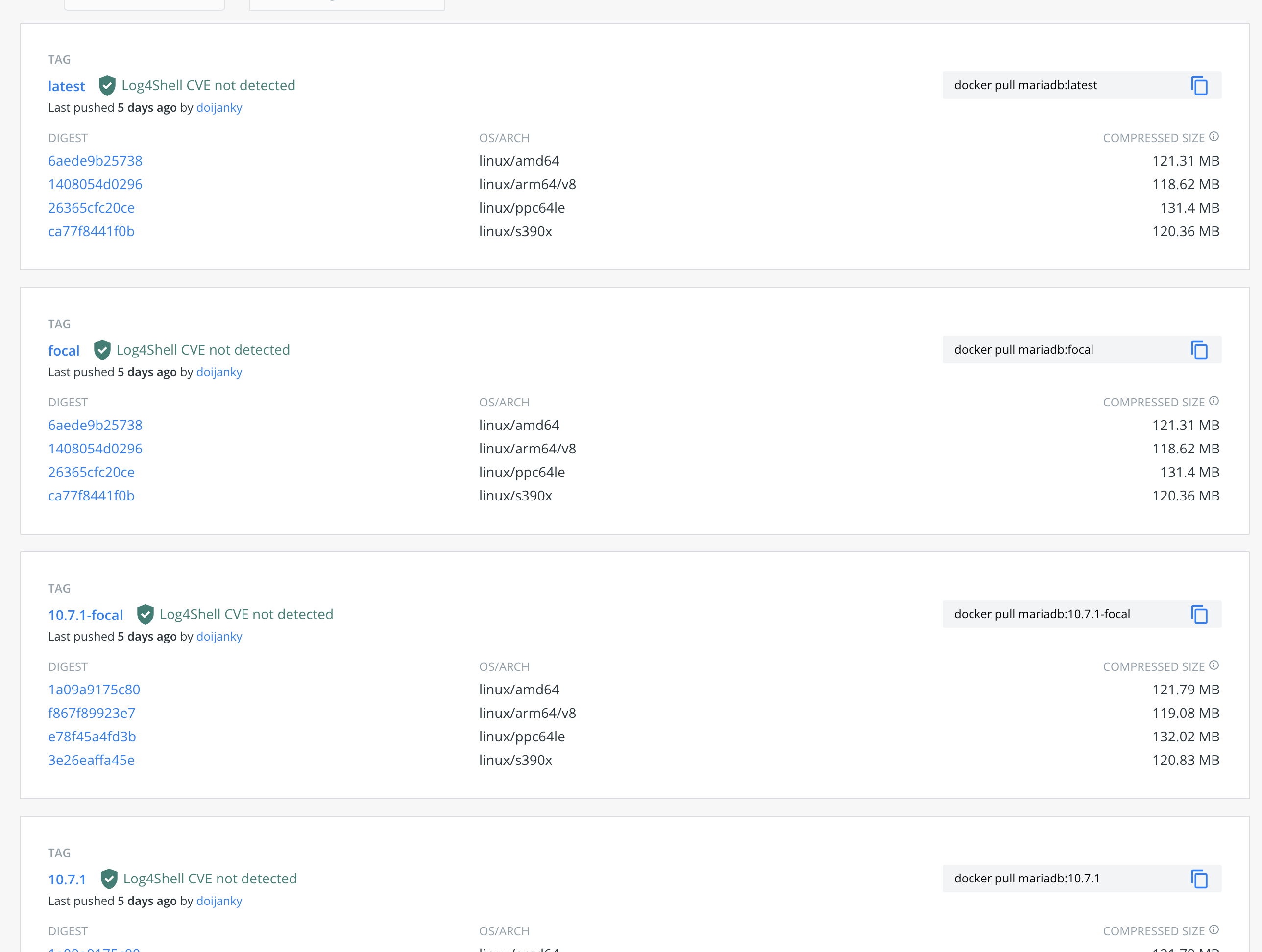 특정 버전의 MariaDB 도커 이미지는 MariaDB 도커 허브 페이지 Tags 메뉴에서 이미지 목록을 확인할 수 있습니다.