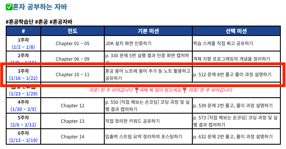 오늘까지 혼공학습단 9기 혼공자바 Chapter 11 까지 공부를 마쳤습니다!