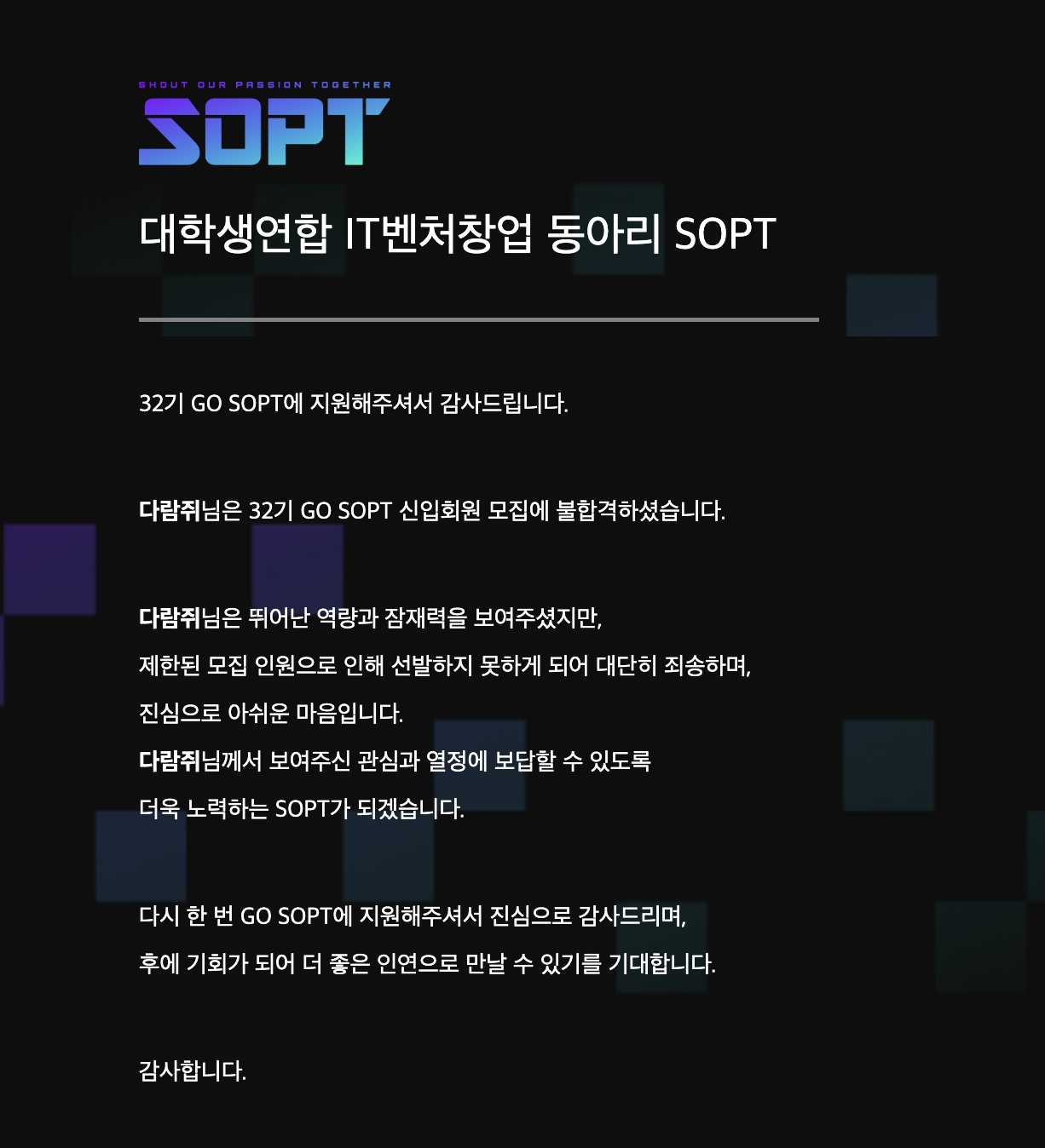 SOPT 솝트 32기 YB 서버 파트 에 지원하였고, 서류 단계에서 탈락했습니다.