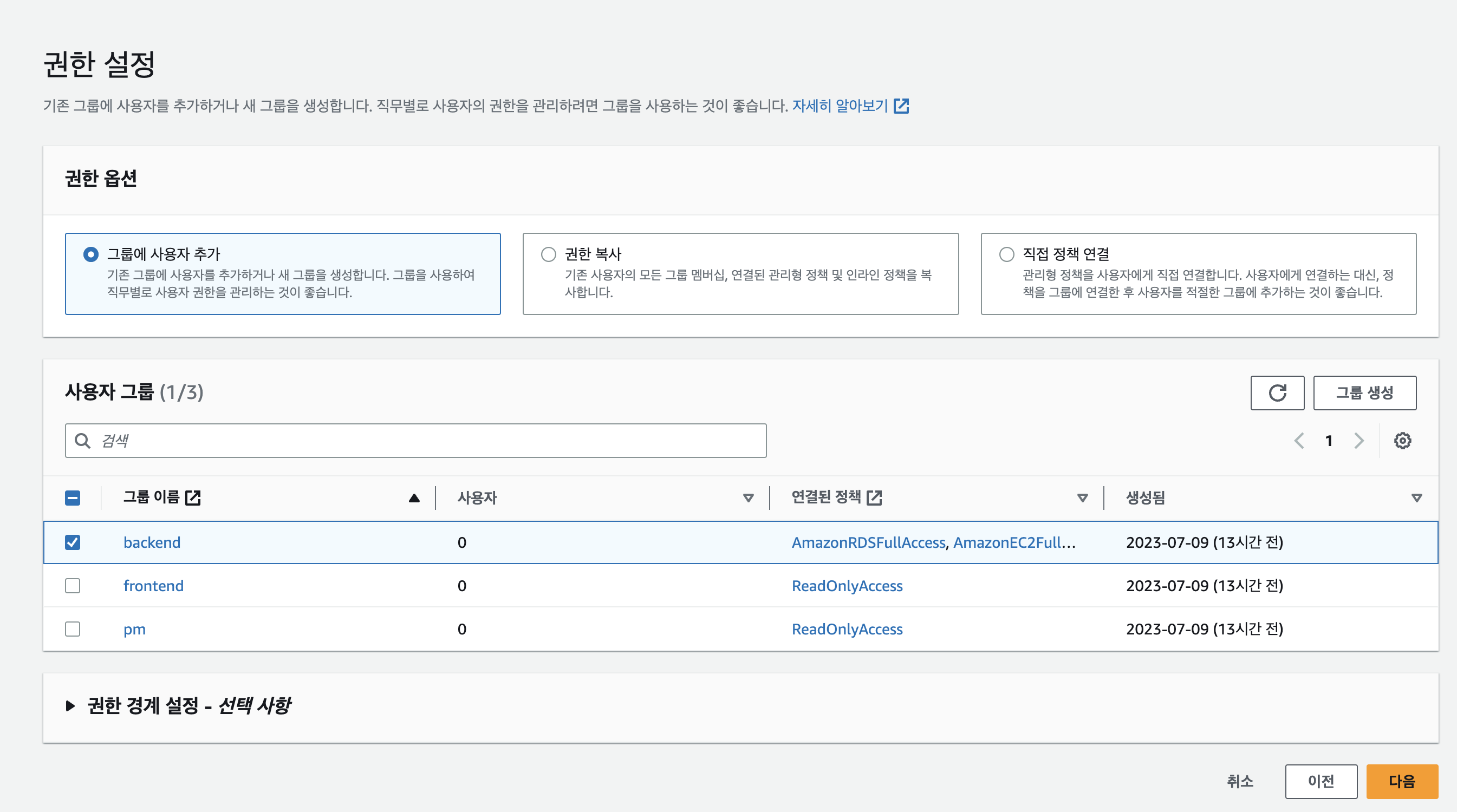 '그룹에 사용자 추가' 권한 옵션으로 backend 그룹에 할당합니다.
