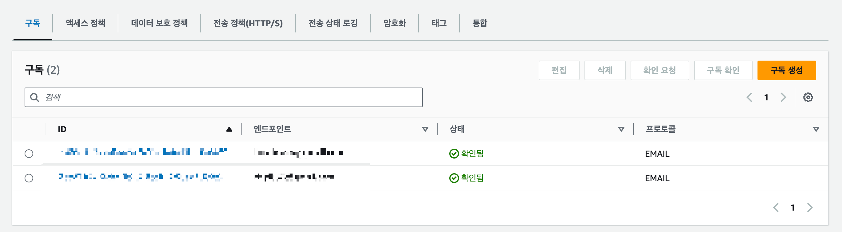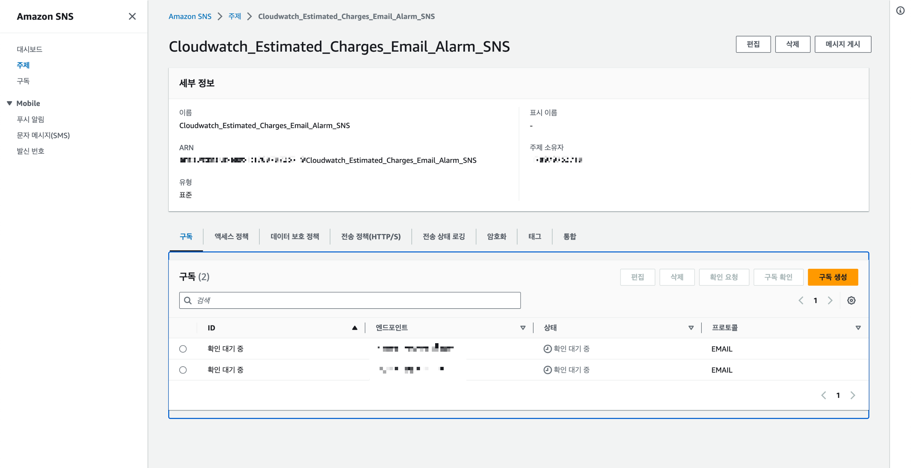 AWS SNS 서비스에서 해당 주제 상세 페이지로 들어가면 아래와 같습니다.