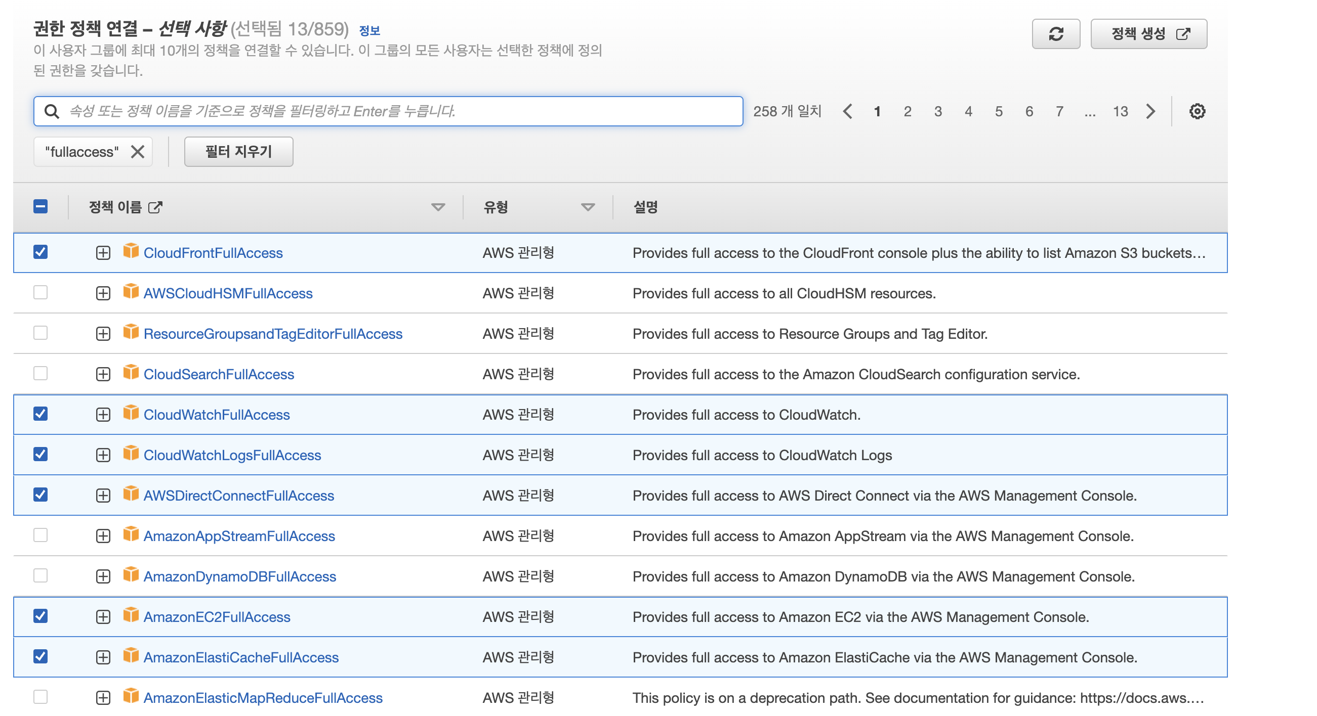 저희 팀의 경우 백엔드 개발자는 FullAccess 또는 ReadOnly 로 필터링 한 뒤, 팀이 사용할 서비스만 선택했습니다.