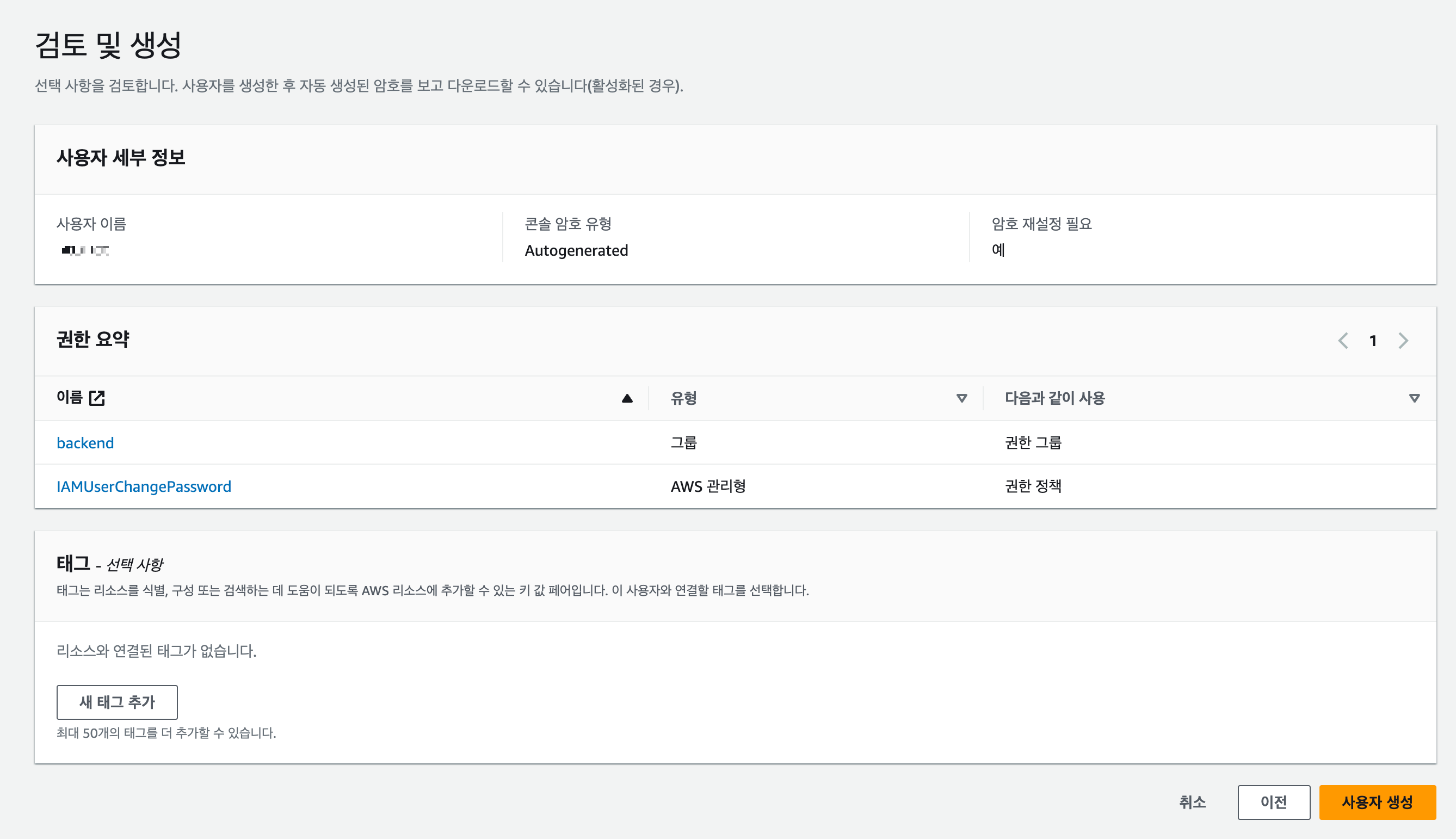 검토가 끝나면 사용자 생성 버튼을 누릅니다.