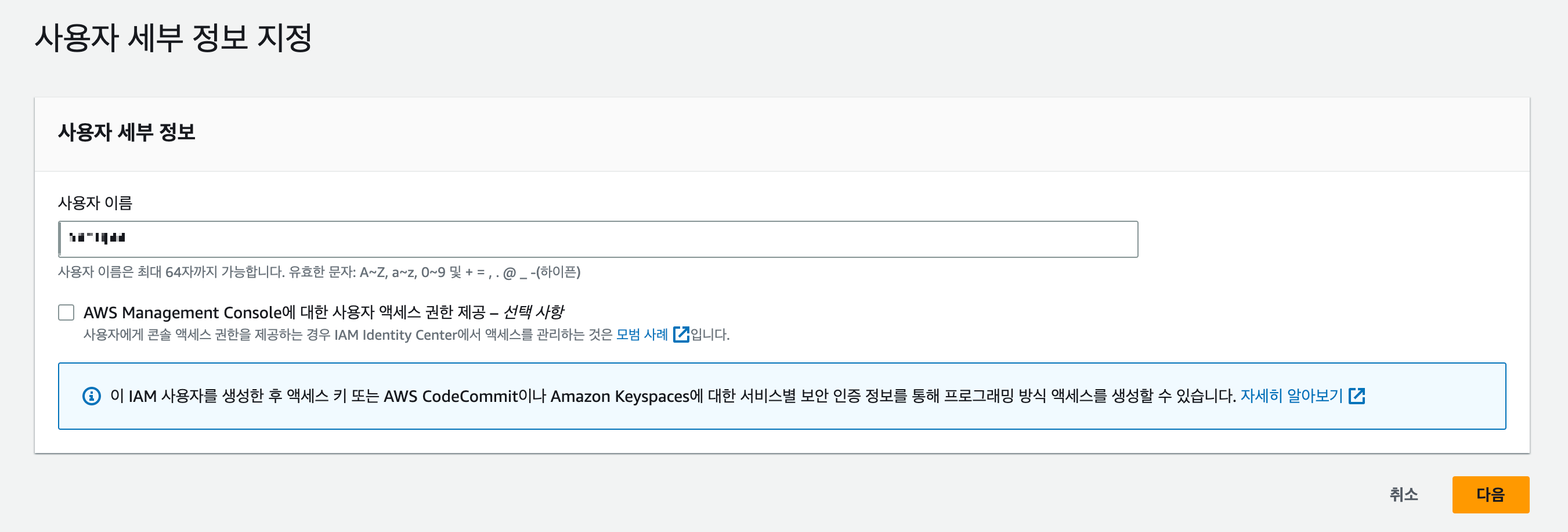 AWS 콘솔에 접근이 가능해야하므로 'AWS Managerment Console에 대한 사용자 액세스 권한 제공' 옵션을 체크합니다.