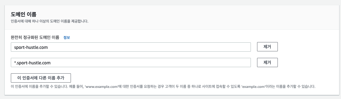 CloudFront 대체 도메인을 와일드카드 (*.sport-hustle.com) 으로 설정해도 목록에서 나타나지 않아 정확히 명시해야 합니다.