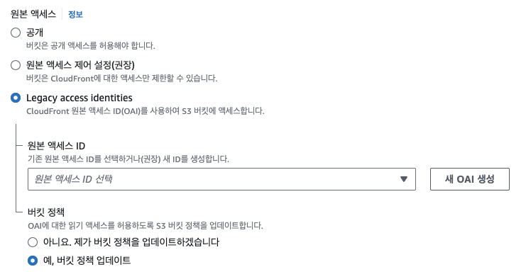 이 옵션을 선택하면 CloudFront 요청을 통해서만 S3 에 접근할 수 있게 됩니다.
