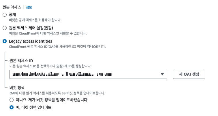 다음으로 원본 액세스 ID 목록을 선택해야 하는데요, 처음에는 없으니 '새 OAI 생성' 버튼을 누릅니다.