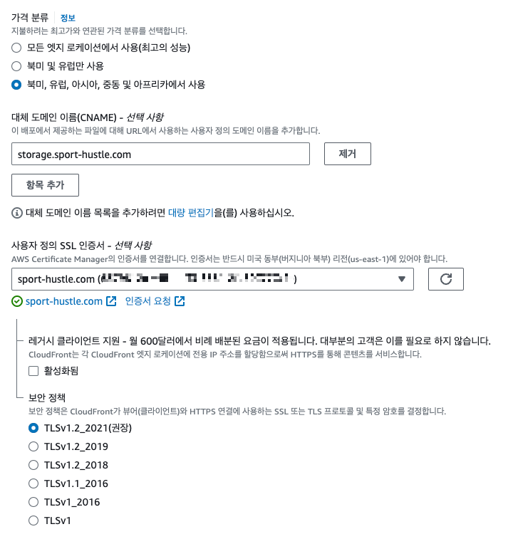 대체 도메인 이름은 storage 서브 도메인으로 사용할 예정이라, storage.sport-hustle.com 으로 입력했습니다.